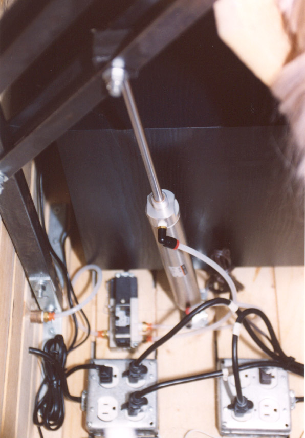 Here you can see the 1-1/2" bore, 10" stroke double-acting cylinder. If you look closely, you can see that I only used a single flow control. There was no need to restrict the flow of air as the cylinder extended. The flow control at the base of the cylinder was used to slow the speed at which the lid closed.